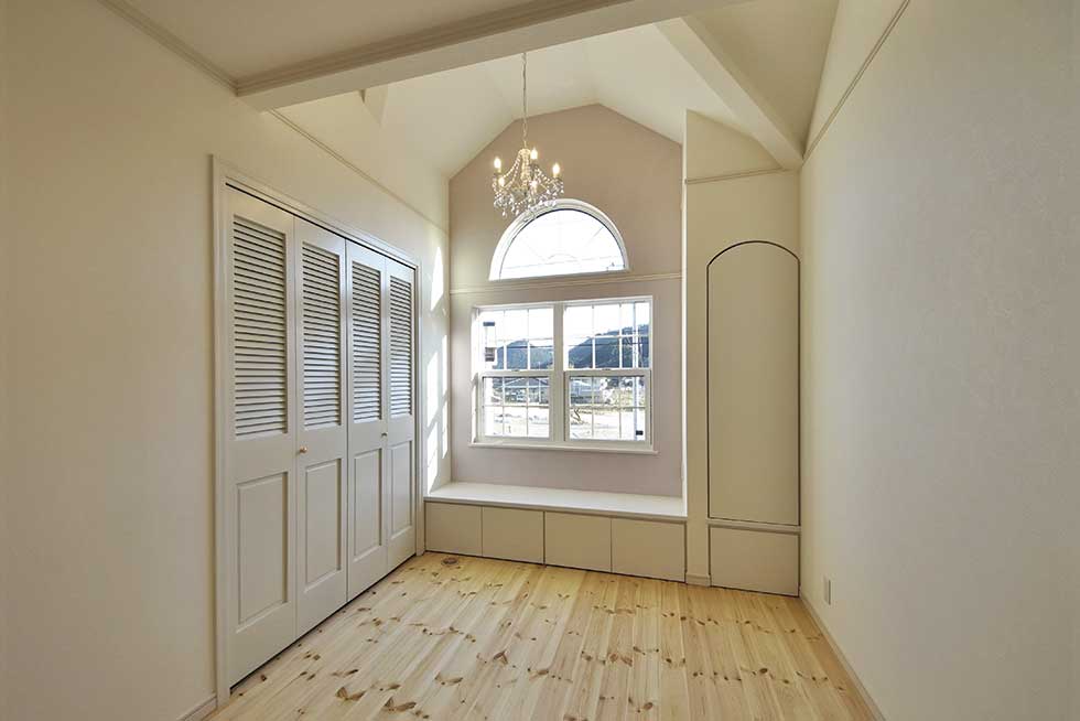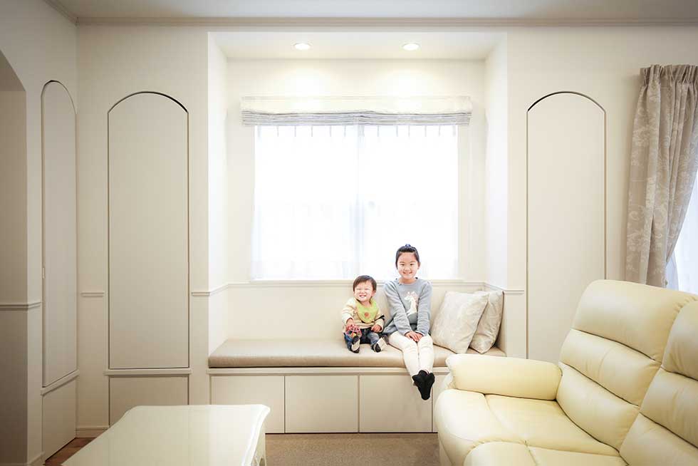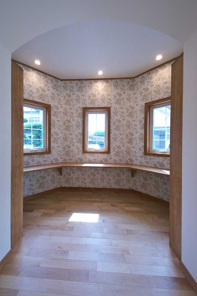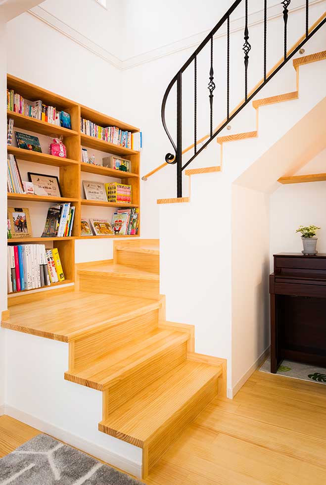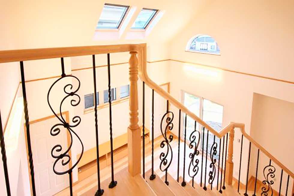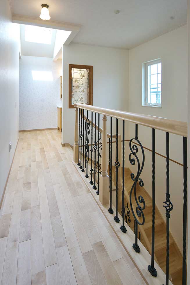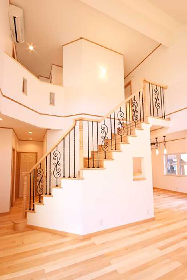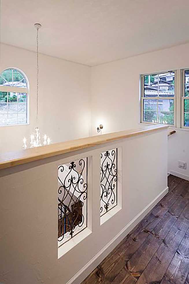 西予市宇和町の物件です 正面にハーフラウンドの窓をアクセントにした可愛らしいお家が出来ました 階段手摺にロートアイアンを使用し、間接照明やベンチシートやなど 暖かみのある家に仕上がりました