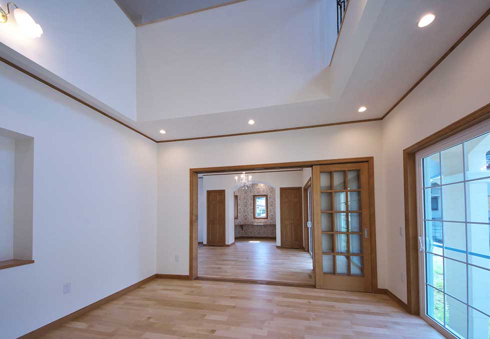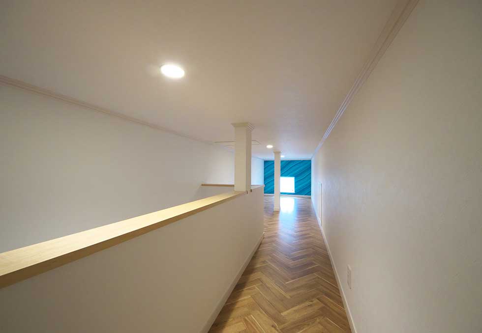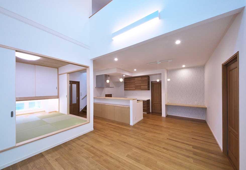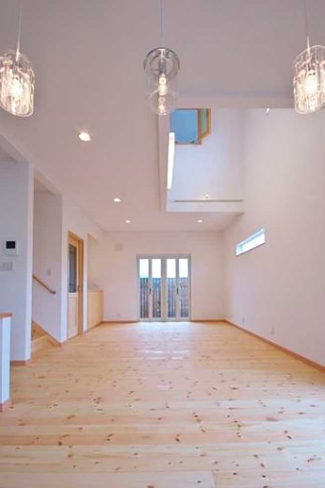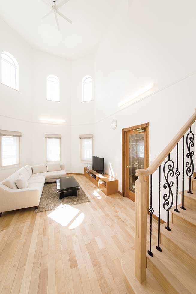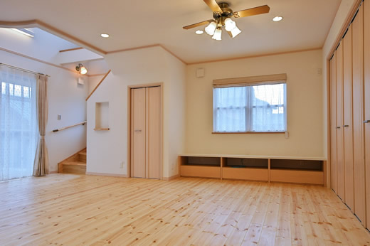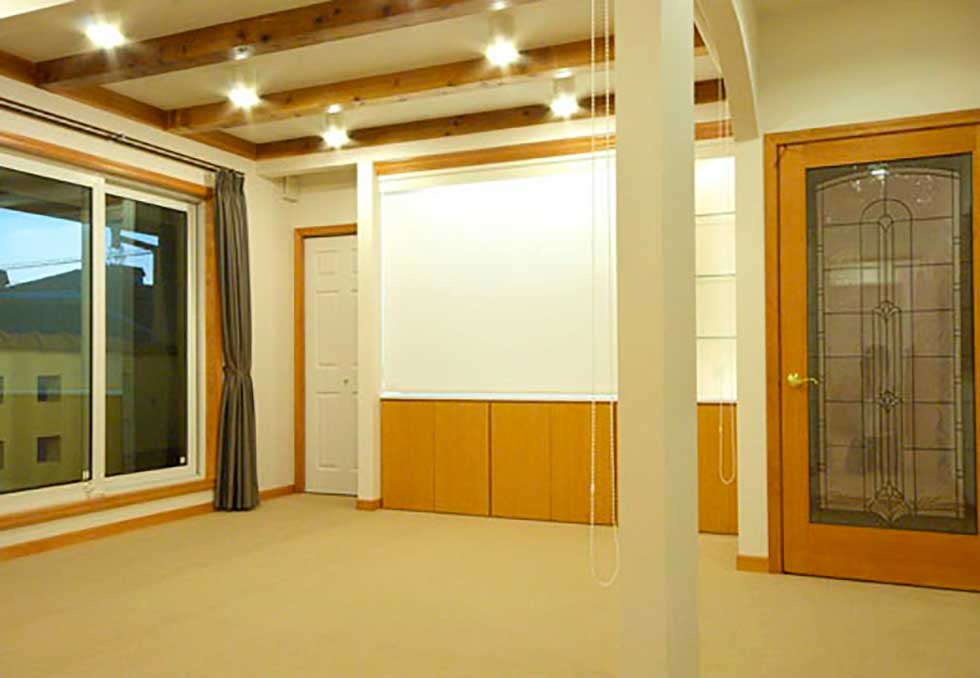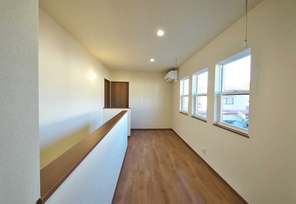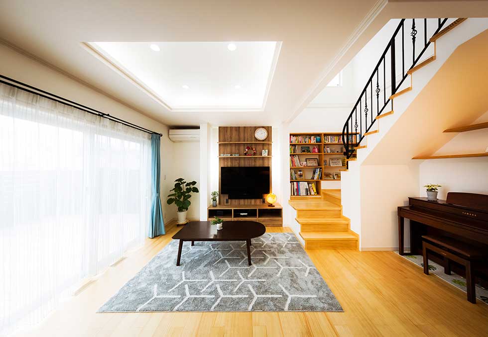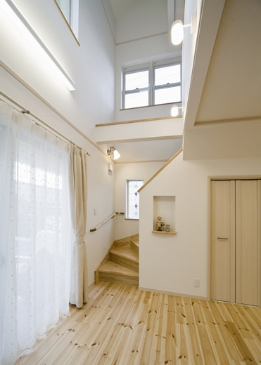 吹抜の空間が大きい為、温水式床暖房を採用し、ドラム仕様の防音室も完備しました。