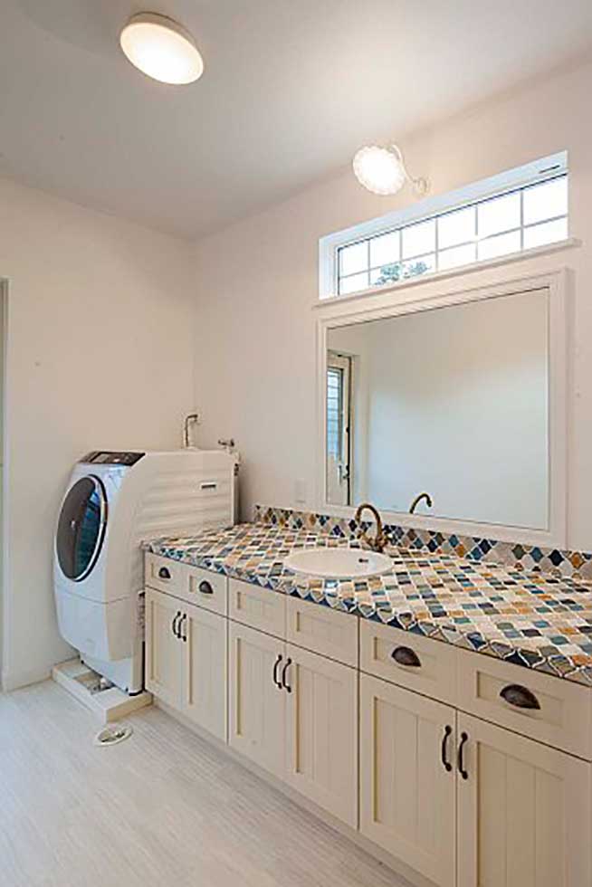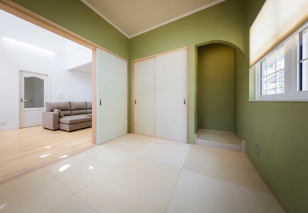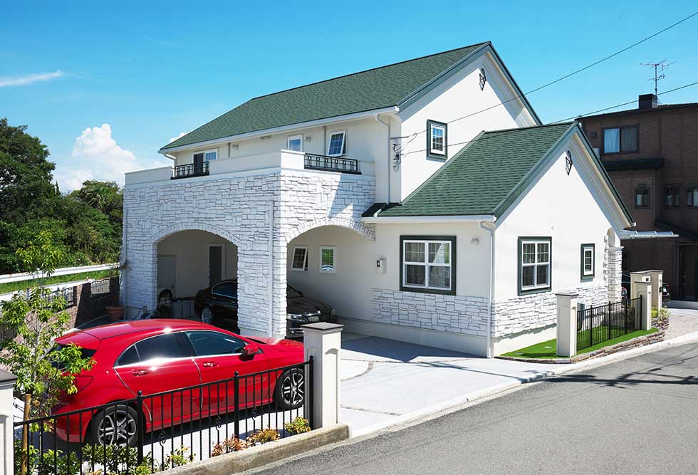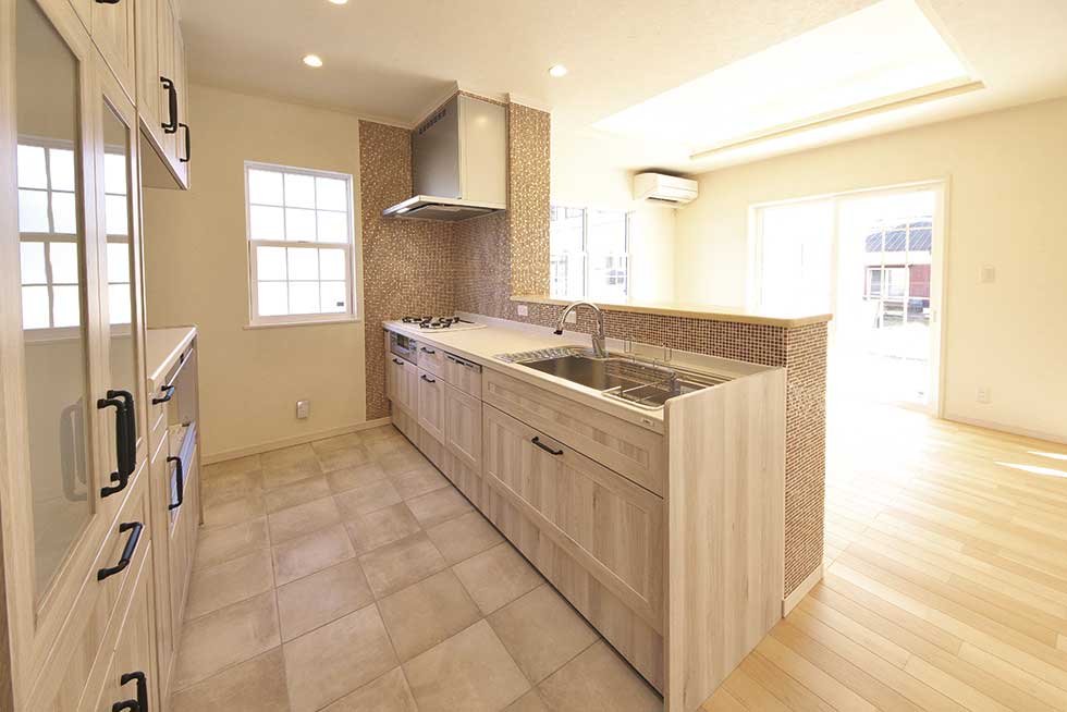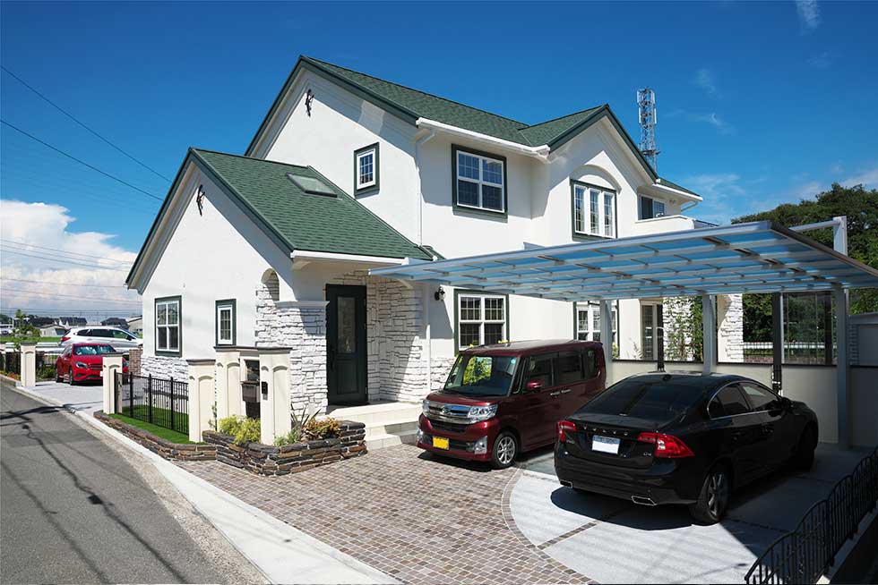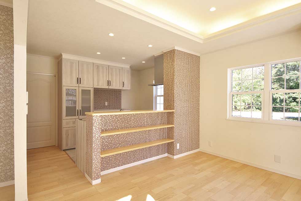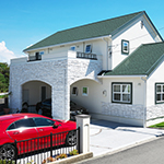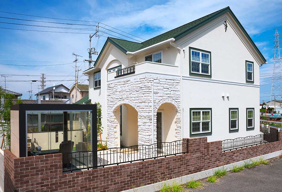松前町の物件です 緑色をテーマカラーとして、アクセントを付けました 外壁をトラバーチン仕上げの高弾性塗り壁と、白い石貼りとしてまとめました 内部キッチンの壁にはガラスモザイクを貼り可愛らしいキッチンになりました