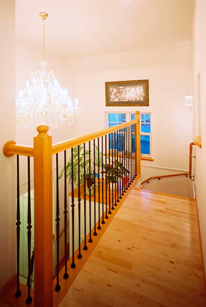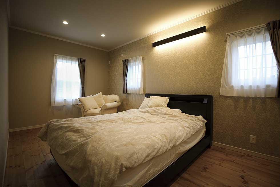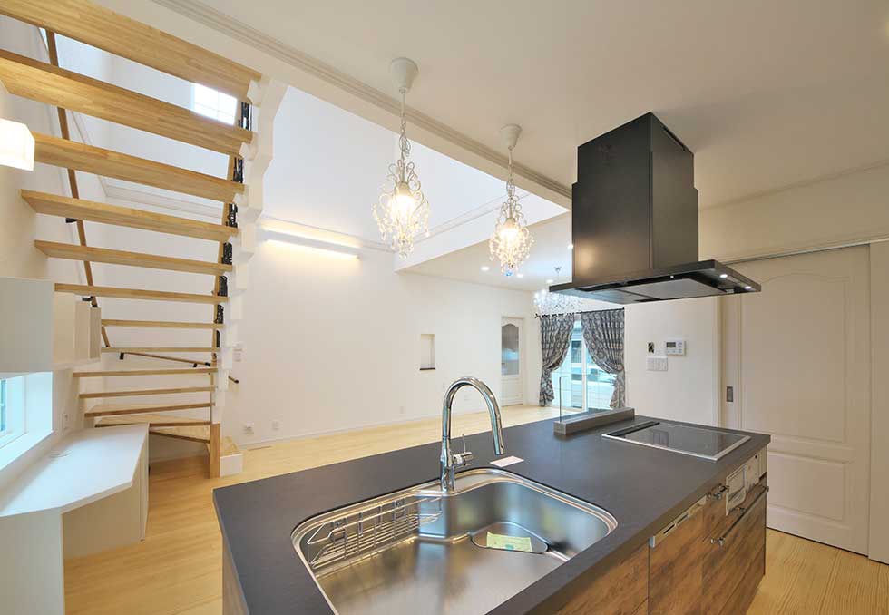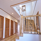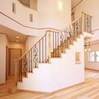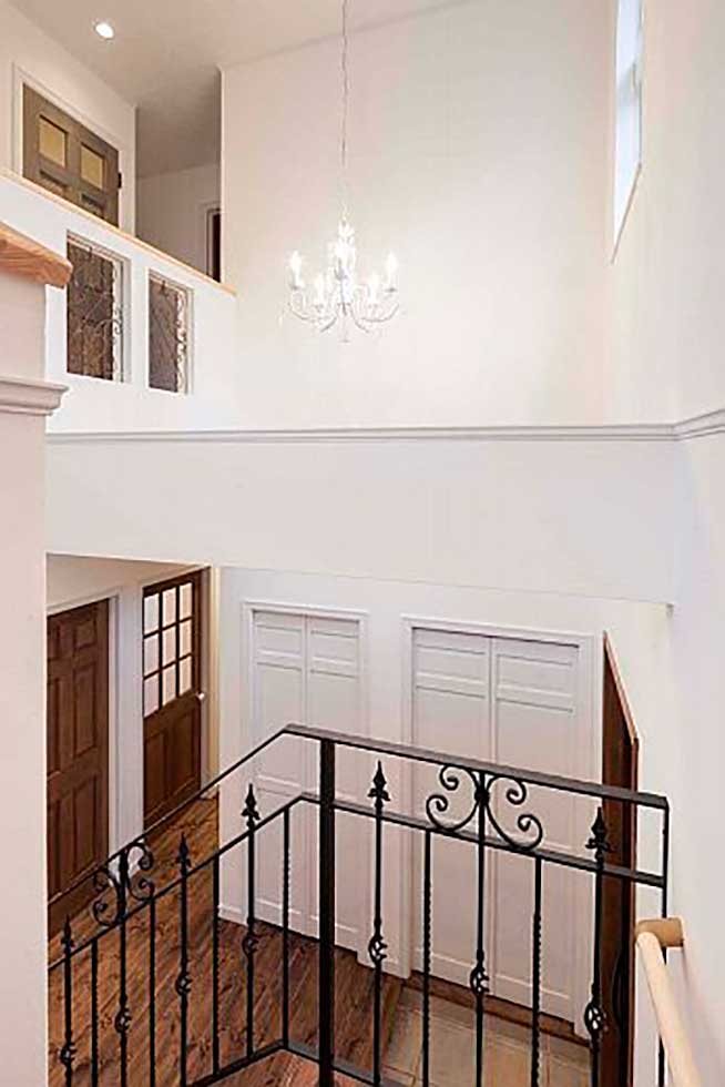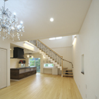 主寝室を1階として、クローゼットから洗濯室、洗面、浴室へと回遊同線をとり、将来的には1階のみで生活できるプランとしました また雨に濡れないで車に乗りたいとの御要望でビルトインレージを採用 リビングの吹抜には、アイアン階段をアクセントに、御施主様が選ばれた シャンデリアが良い雰囲気を作っています