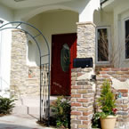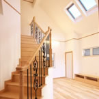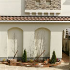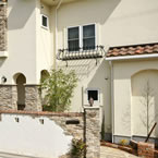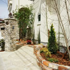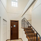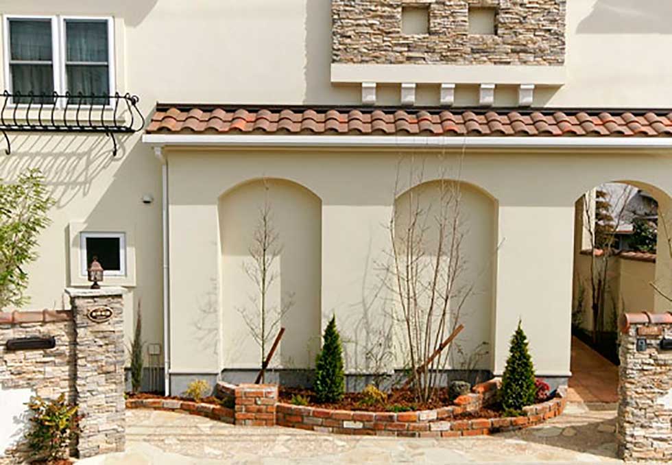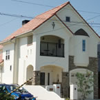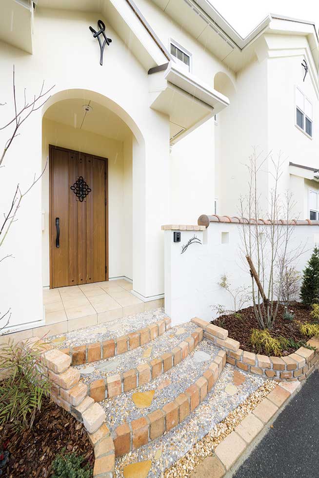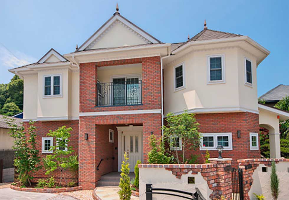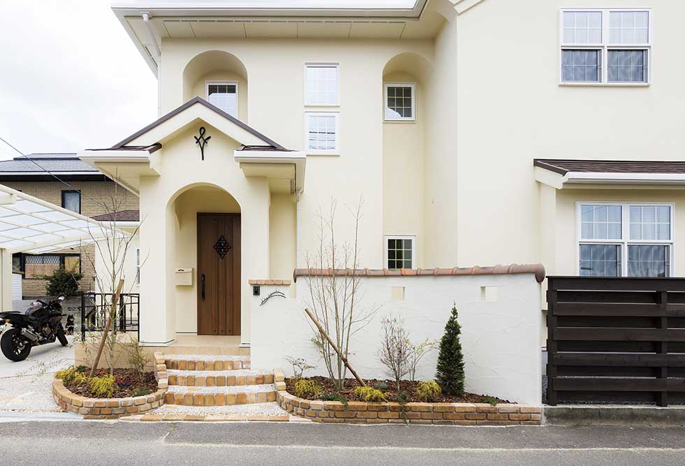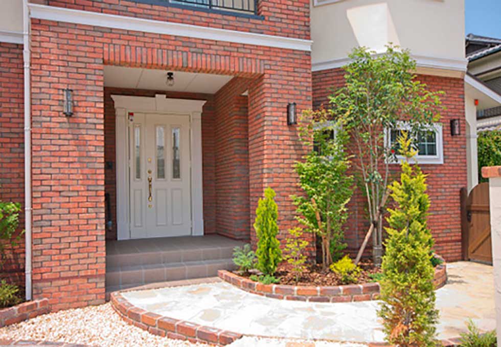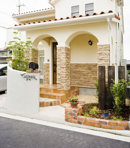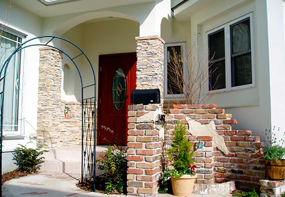 福音寺町の物件です スライス煉瓦をアクセントとして外観を仕上げました 煉瓦以外の壁はトラバーチン仕上げの高弾性塗り壁です 玄関ホールと一体になったアイアンテスリの階段は 設計依頼の時の御要望でした 玄関ホールに家族個人分の収納をもうけて、家の中に個人の物をなるべく置かないように設計しています