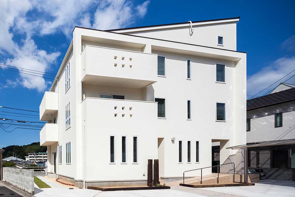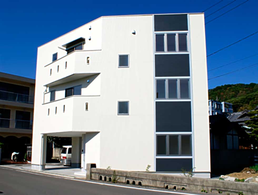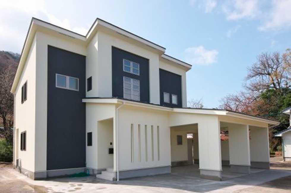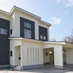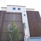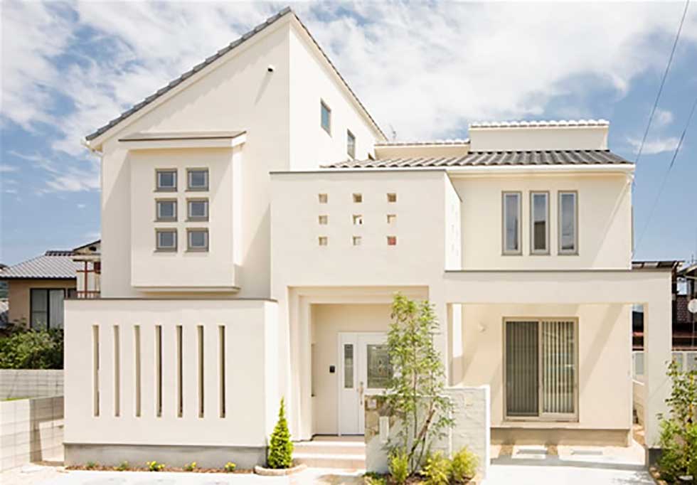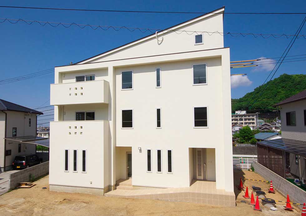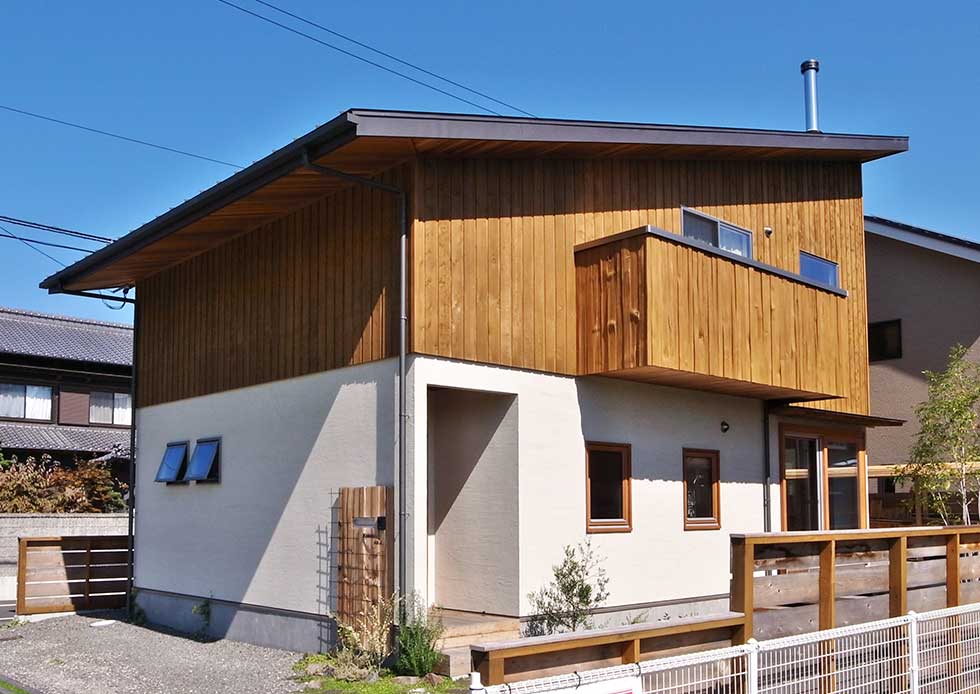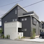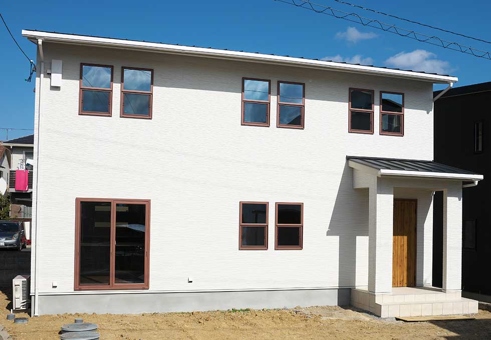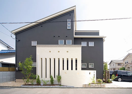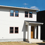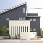 松山市富久町の物件です 地中熱利用の熱交換換気システムと樹脂サッシ、そして高気密、高断熱に加え 遮熱シートで家全体を覆っている為非常に熱効率の良い住宅となっております 南北に長い敷地の為、道路と反対側に中庭を設けて各部屋への採光を確保しています、建物外壁に凹凸を付ける事で建物表情に変化を付けています