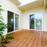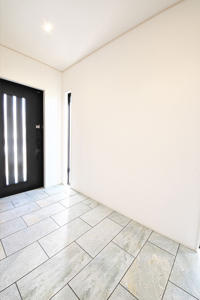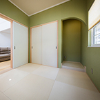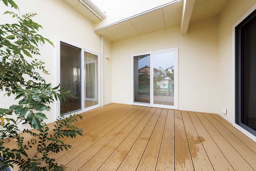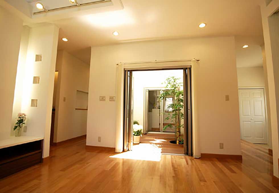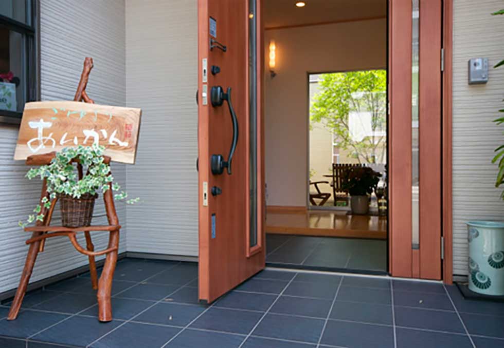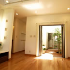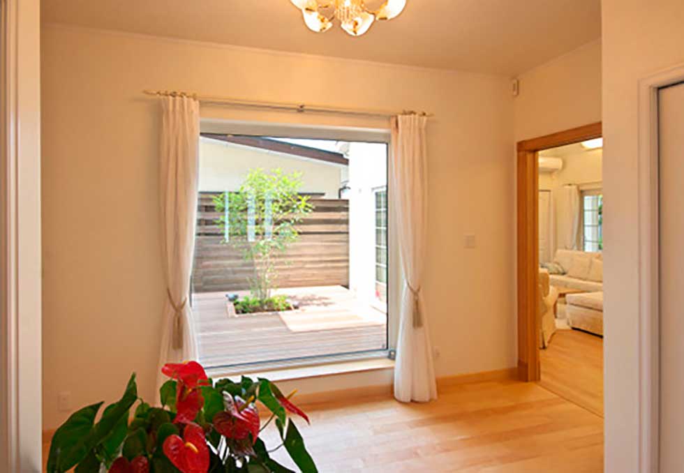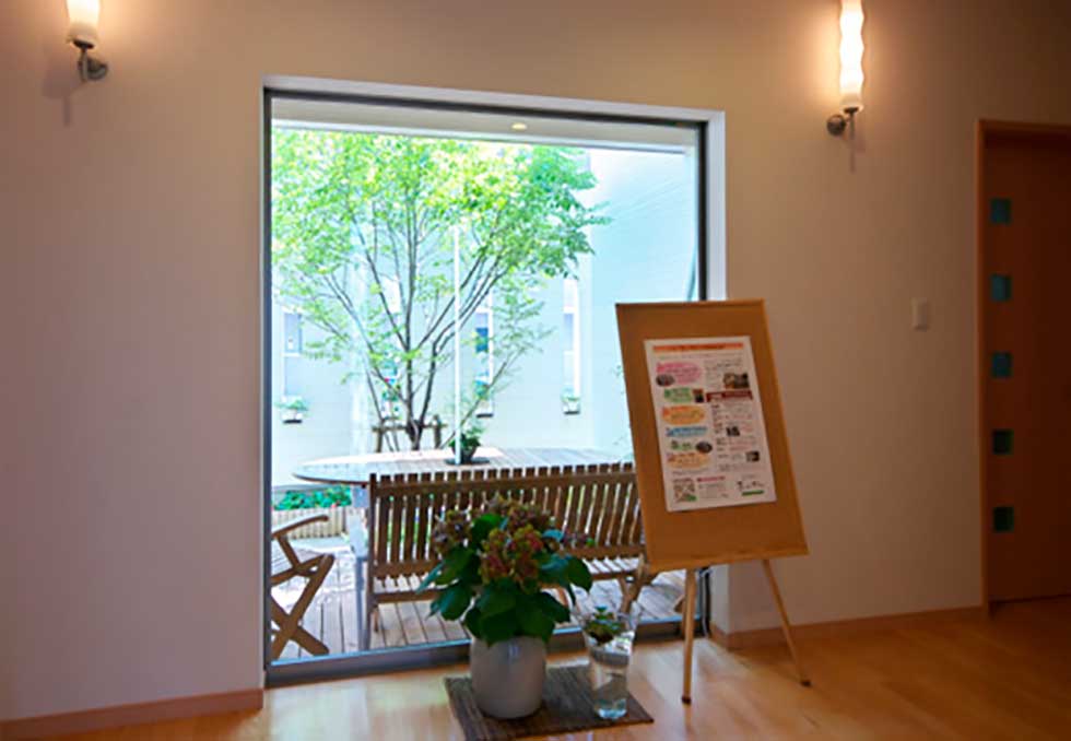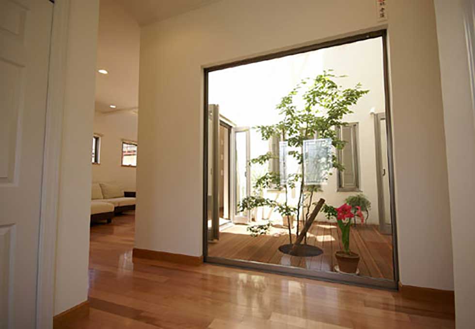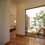 展示場の玄関に外部からの視線をカットした中庭をもうけてゆとりのある展示場としました。