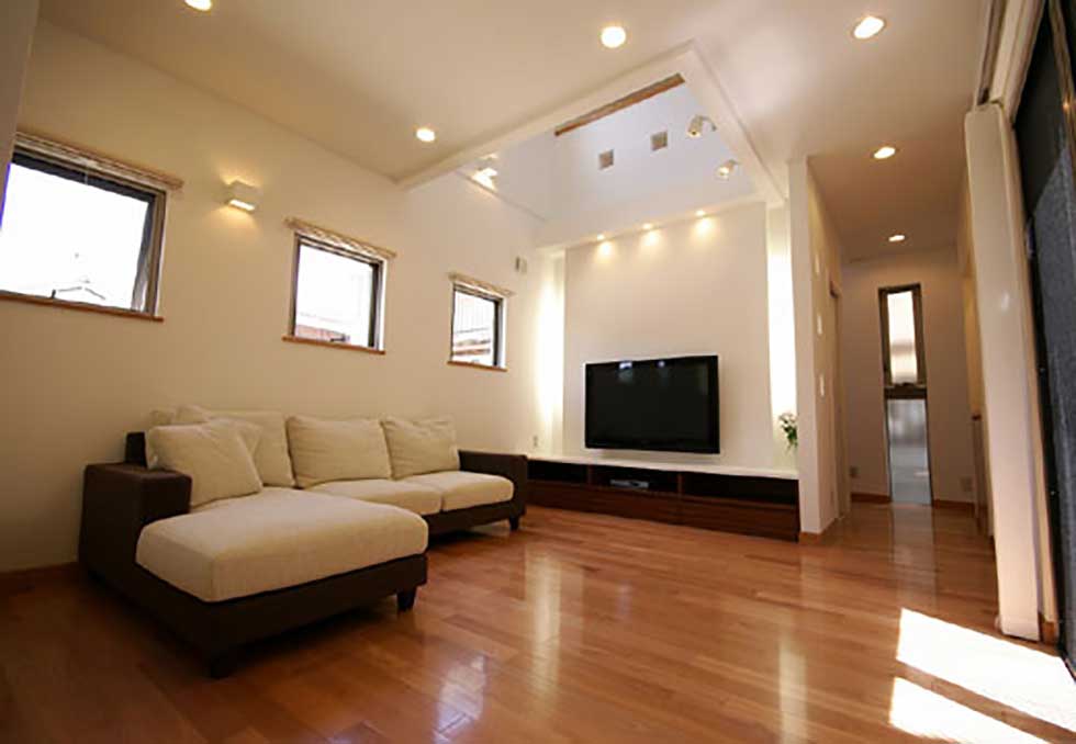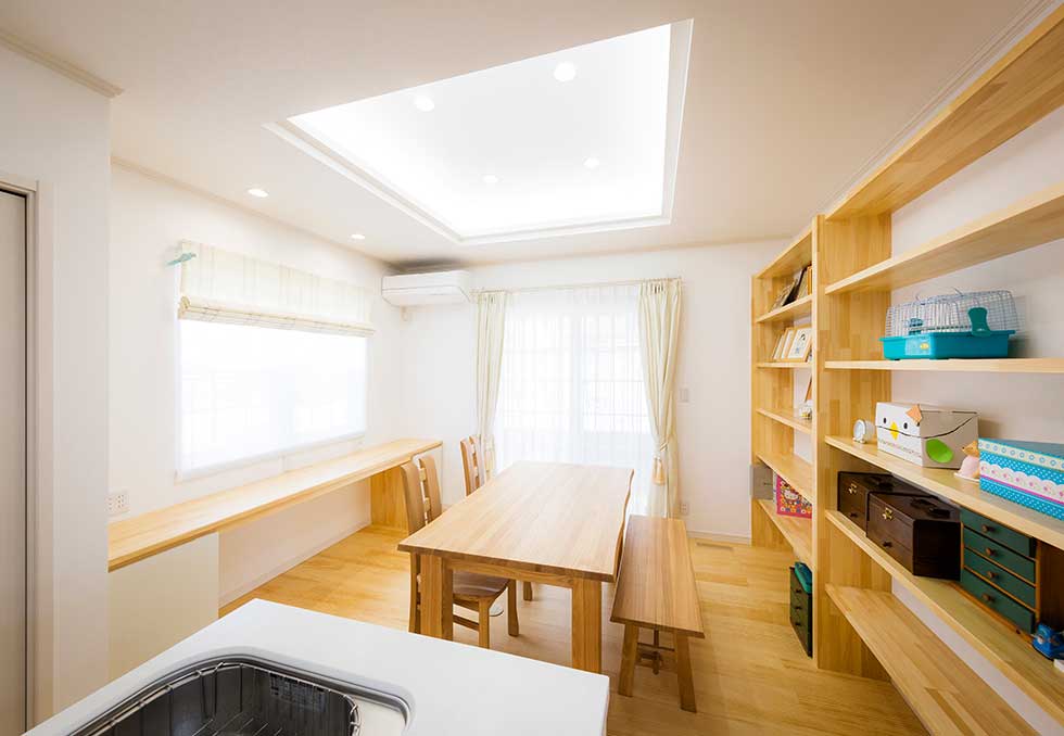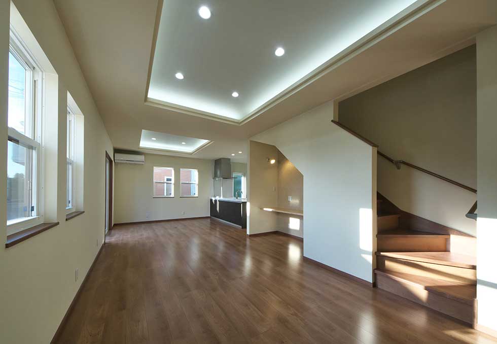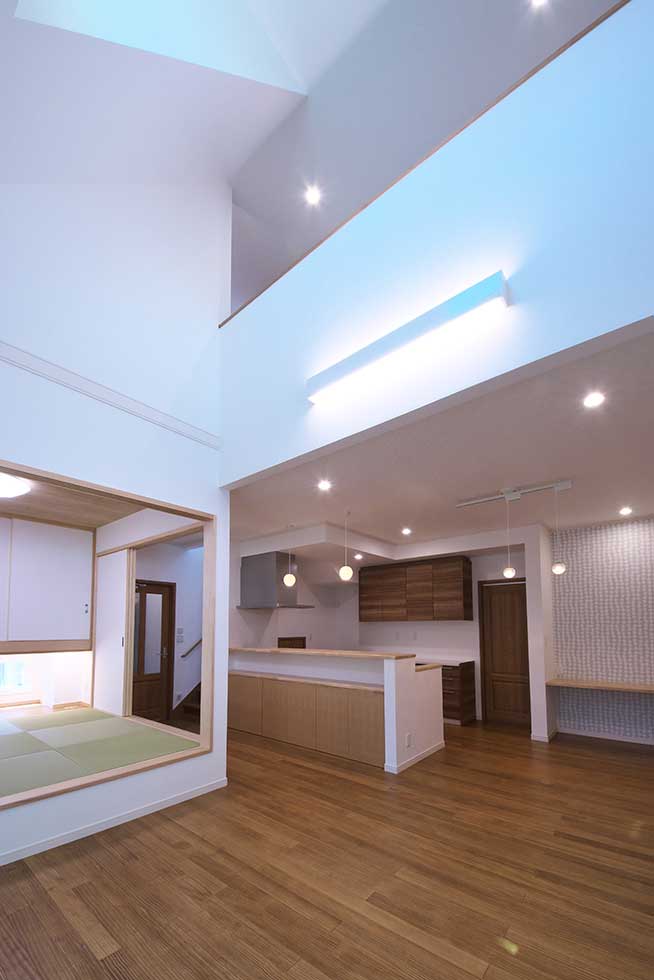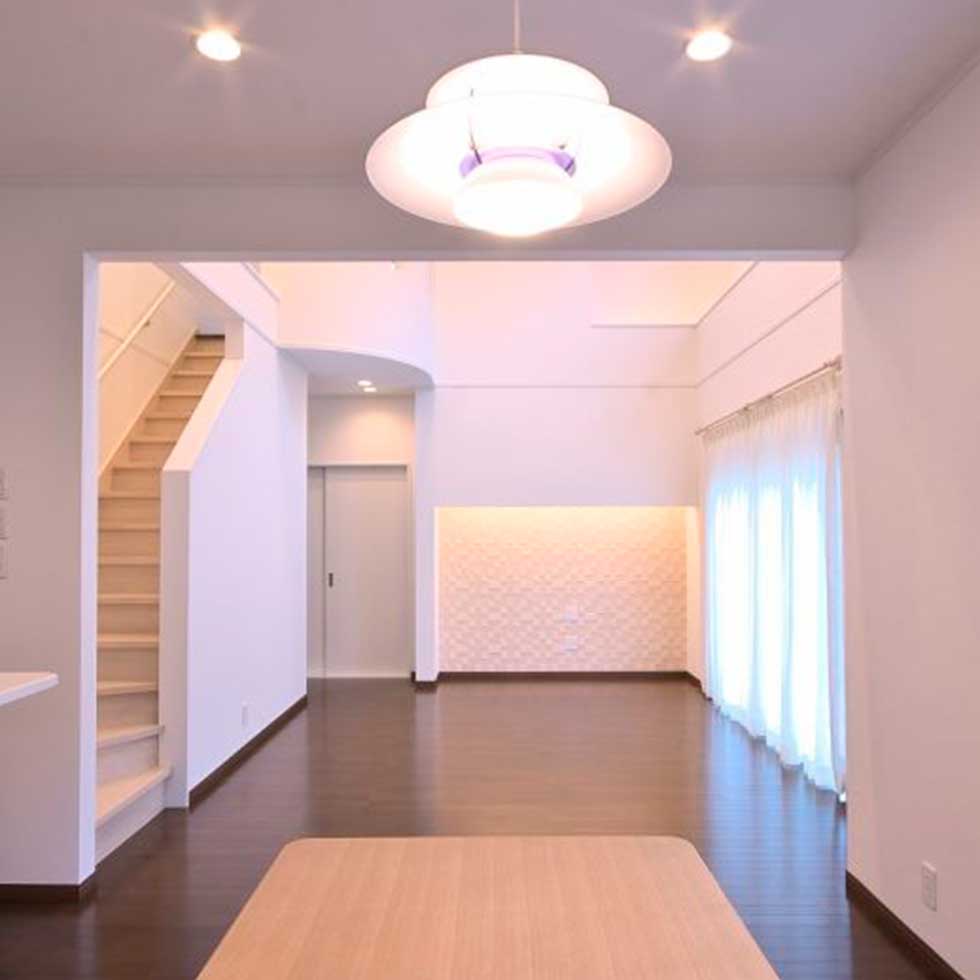ソーラーパネルを乗せた、ZEH仕様の住宅です 私の物件は、どの住宅もソーラーパネルを乗せれば 「ZEH住宅」となる仕様での設計施工です リビングダイニングを間接照明として、アクセントを付けさせて頂きました