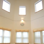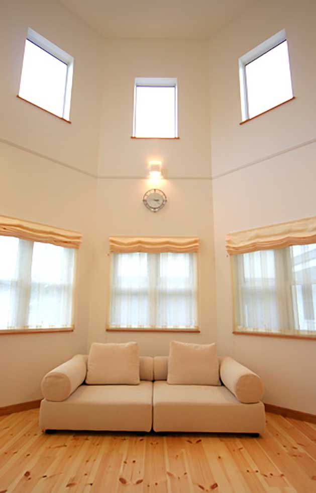 八角形の吹抜リビングより、一日中光を取り込むが、夏の直射日光があまり入らないように庇の長さを計算しています。