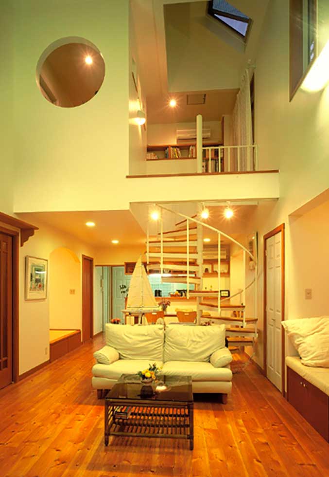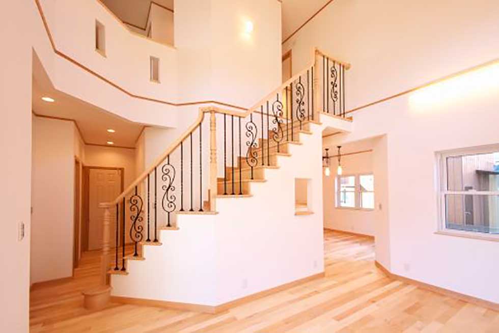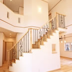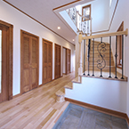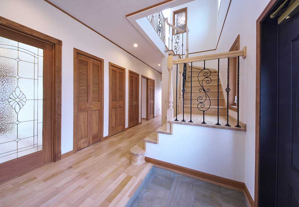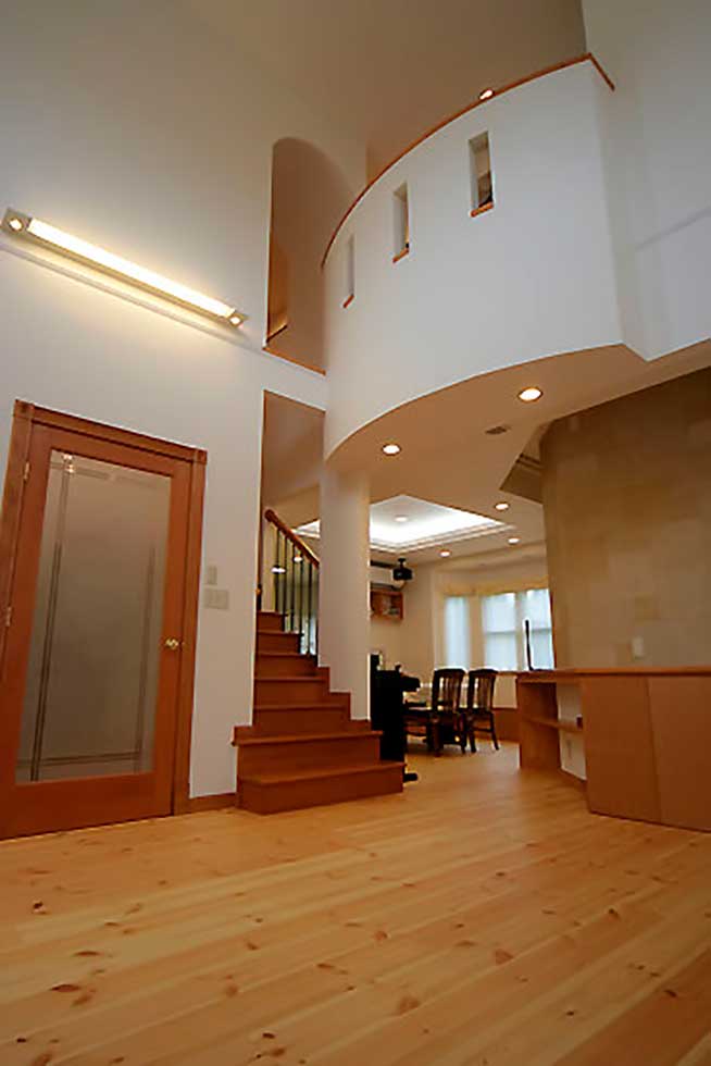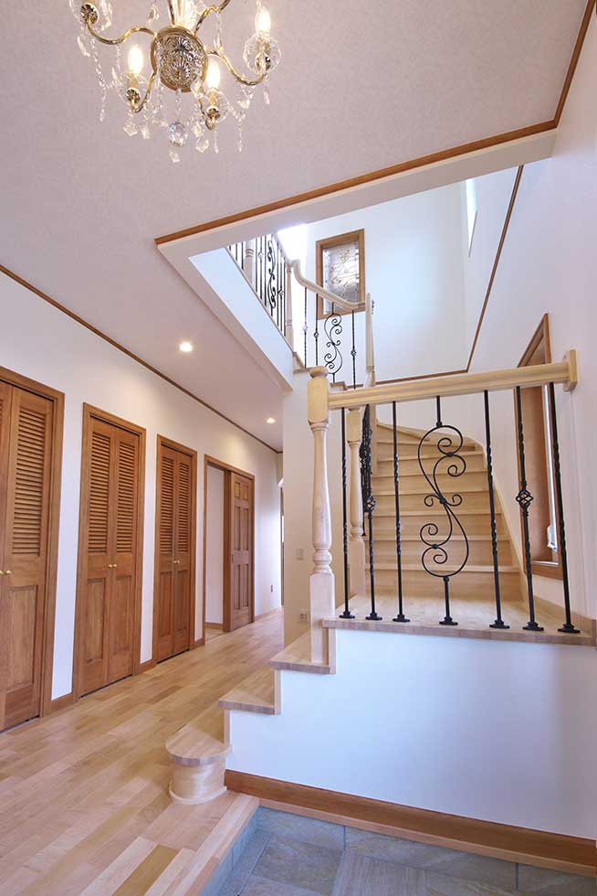 主寝室を1階として、クローゼットから洗濯室、洗面、浴室へと回遊同線をとり、リビング横には和室も配置して将来的には1階のみでも生活できます 御施主様の御要望でサーキュラ階段を取り入れたいとの事でしたので 玄関ホールにサーキュラ階段を設置し、インパクトのある玄関ホールとなりました