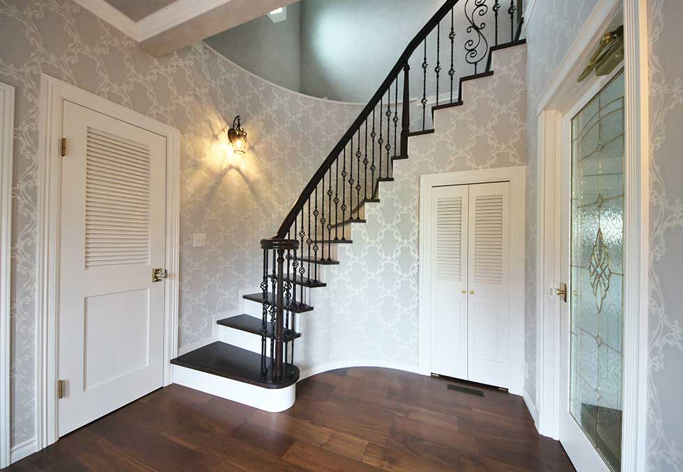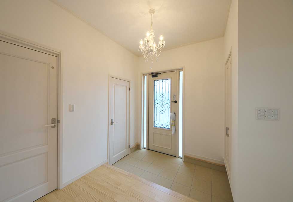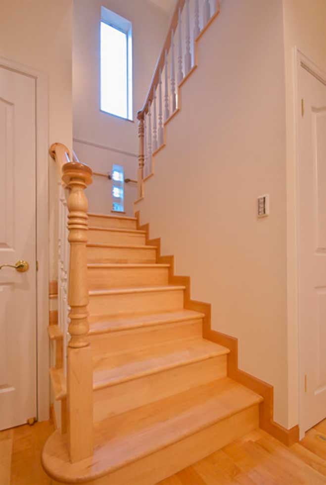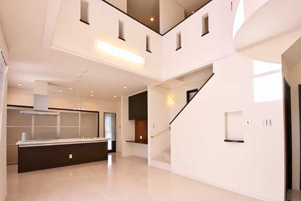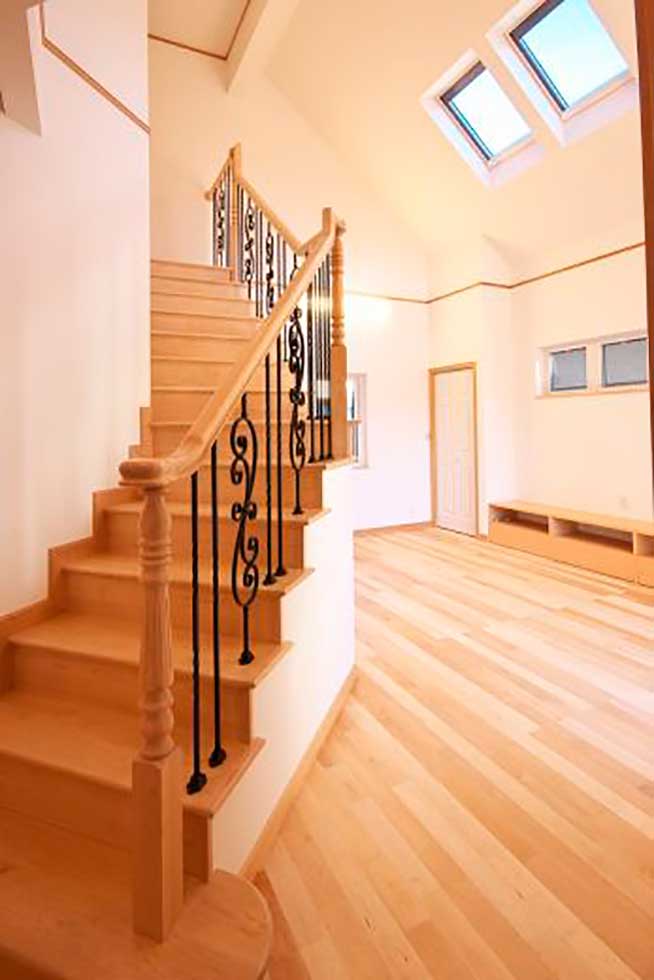 主寝室を1階として、クローゼットから洗濯室、洗面、浴室へと回遊同線をとり、リビング横には和室も配置して将来的には1階のみでも生活できます 御施主様の御要望でサーキュラ階段を取り入れたいとの事でしたので 玄関ホールにサーキュラ階段を設置し、インパクトのある玄関ホールとなりました