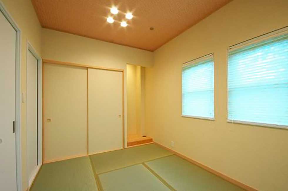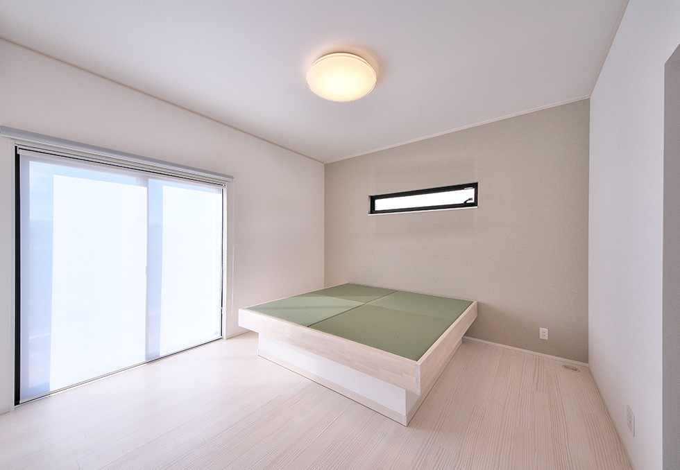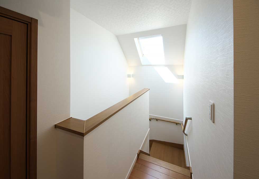 敷地に余裕が有る為、主寝室を1階とした キッチンから洗濯室、洗面、浴室を回遊同線でつなぎ効率的な家事同線とした 2階が2部屋のみとなる為、小屋裏利用の2階建てとした 外観はコンパクトに見えるが和室も吹抜もあり、施工面積は45.41坪あります 御施主様の御要望で気密測定をした結果、C値=0.5と掃出し窓が2ヶ所あるのを考慮すると良い数値かと思います