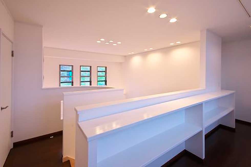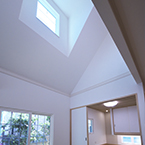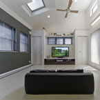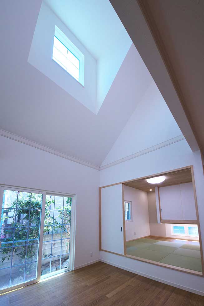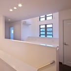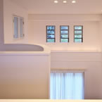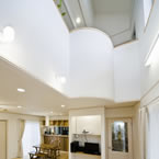 ビルトインガレージ付で広く明るいLDKと書斎との要望でしたが、準工業地域で南北に細長い敷地の為、パティオを取込み屋根の高さに変化を持たせる事で、将来南側にある程度の高層建築物が建築された場合でも、明るくプライバシーの保てる空間としました。