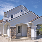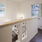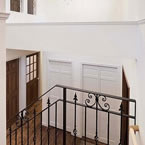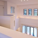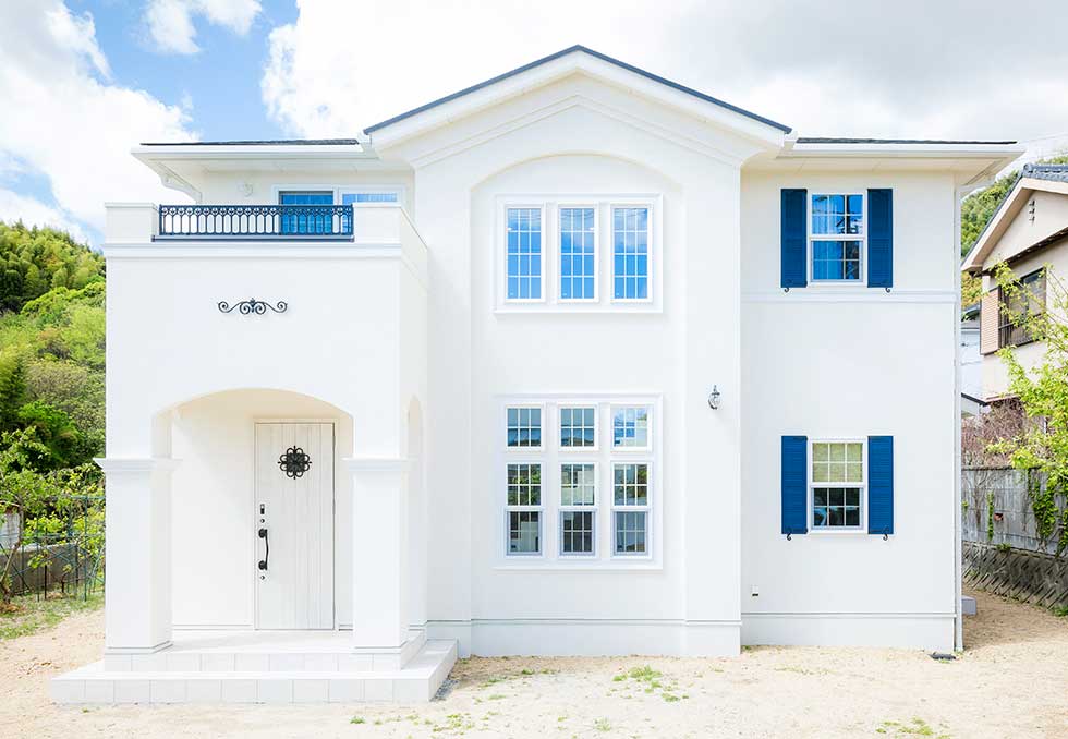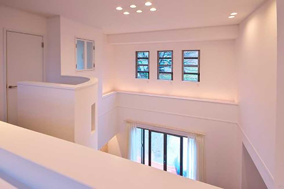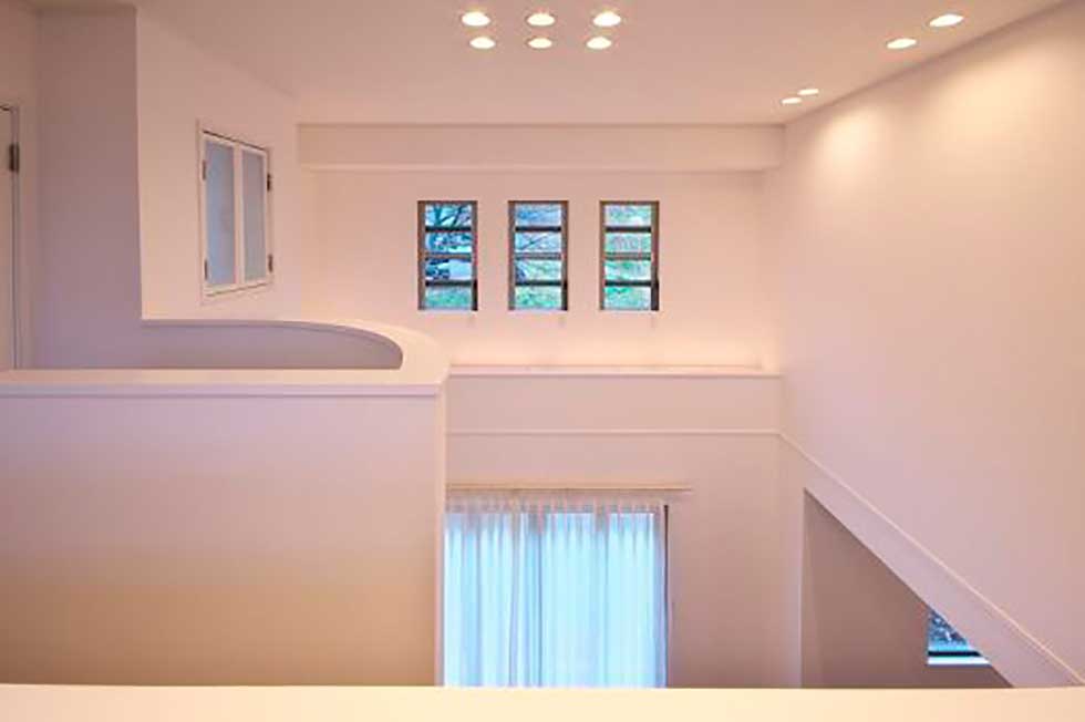 白いトラバーチン仕上の塗り壁とアクセントに濃紺のルーバーシャッターを取り入れシンプルで高級感のあるデザインとしました 内部は吹抜けを上って行くストリップ階段が特徴的です 家の中心にキッチンを配置して、洗濯物干室も洗面脱衣室と連続させ 非常に家事動線の良いレイアウトプランとする事が出来ました
