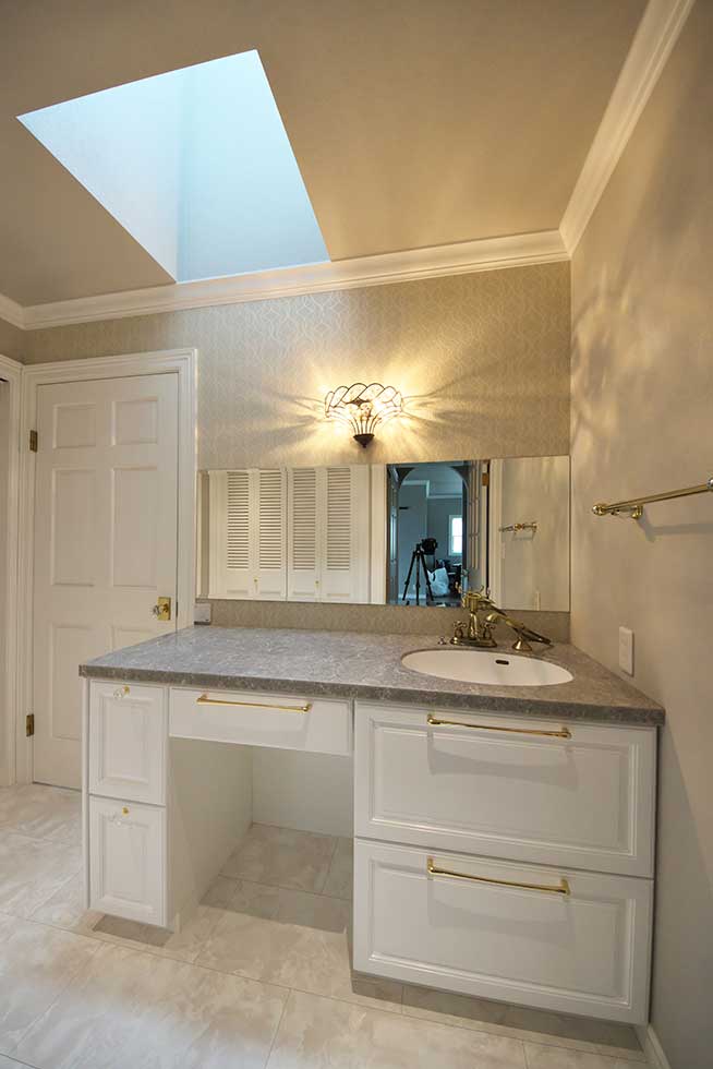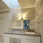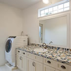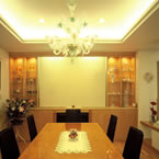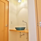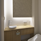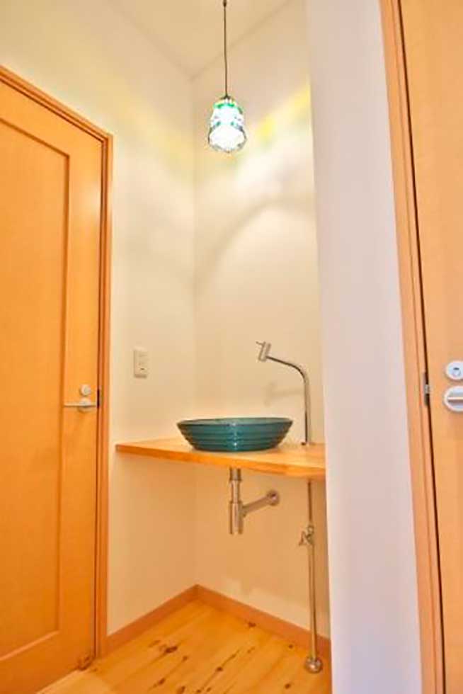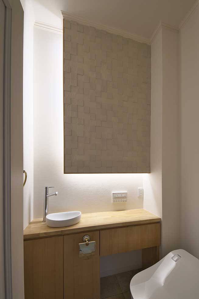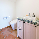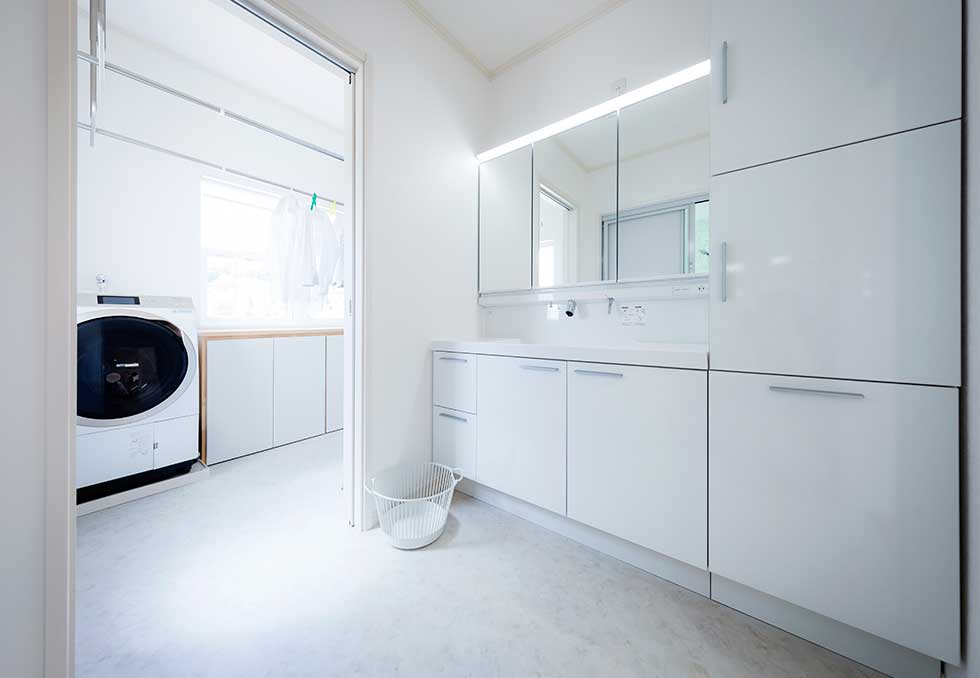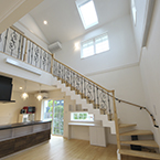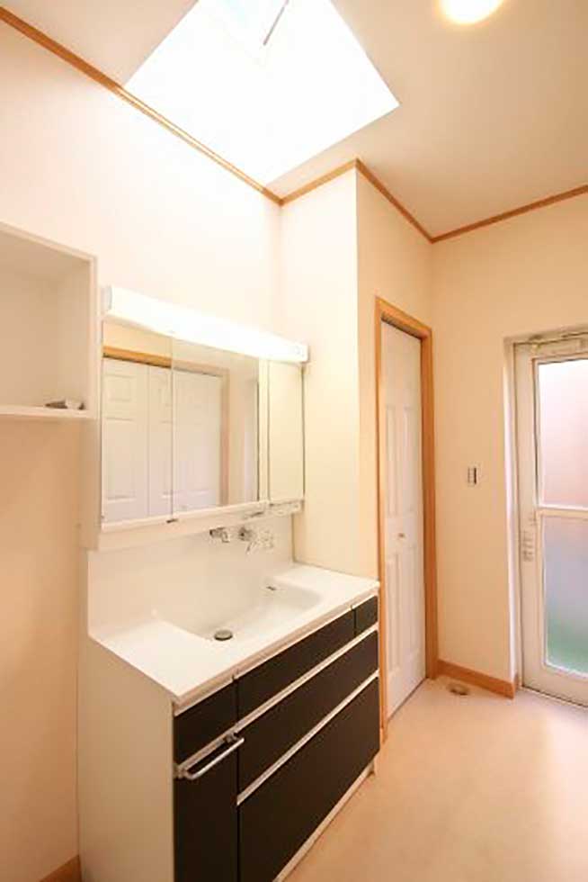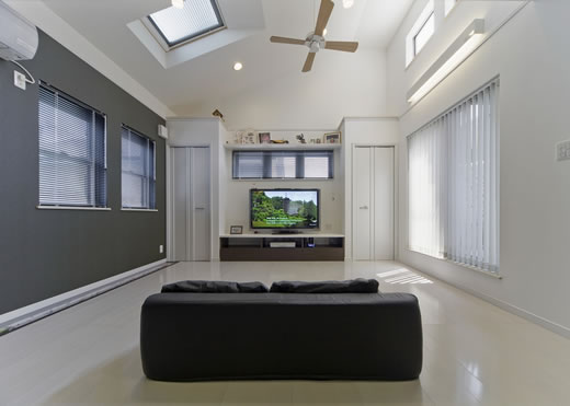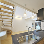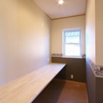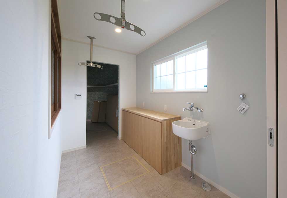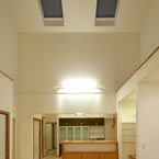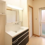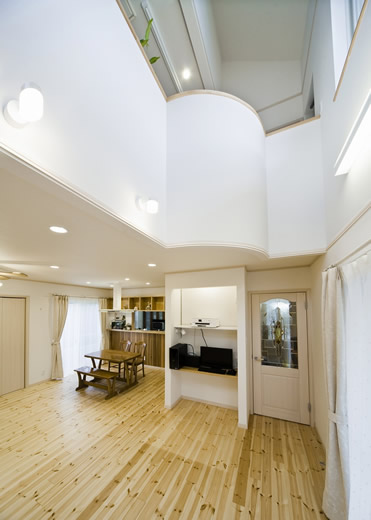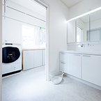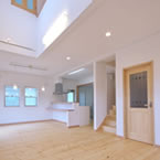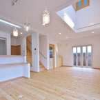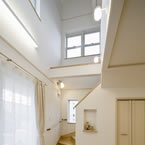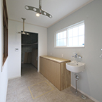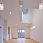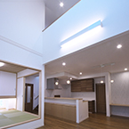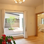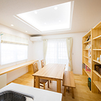 御施主様の求める条件が、 「中庭のある家」 「ダイニングとリビングスペースの分離」との事でした。 主要な部屋を南に配置しながらも、外部からの視線を遮断して 中庭や吹抜&天窓から採光と風を招き入れるプランとしています。 また洗面脱衣室の中で、アイロン掛け等も出来る様に スペースにゆとりを持たせています。