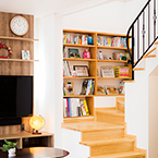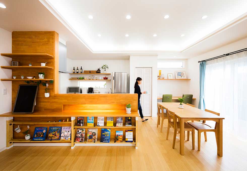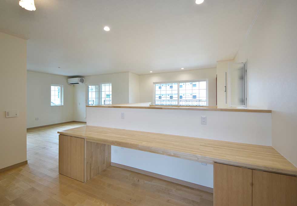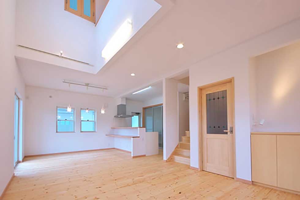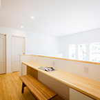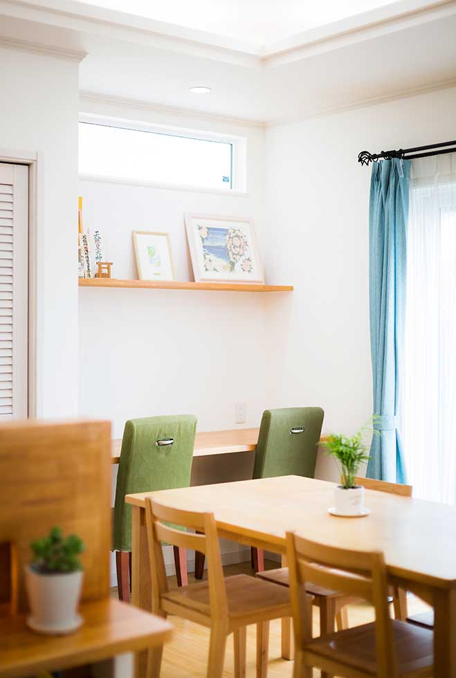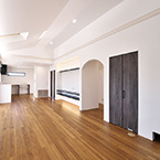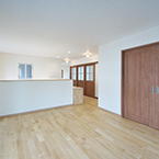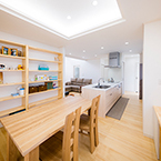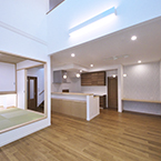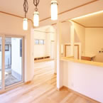 敷地にあまり余裕がないが、外構も駐車スペースも確保したかったので あえて浴室、洗面、物干スペースを2階に配置し リビングには、無垢の木材を多めに使用して、壁天井には調湿効果のあるコテ塗り壁として暖かい雰囲気の空間としました。